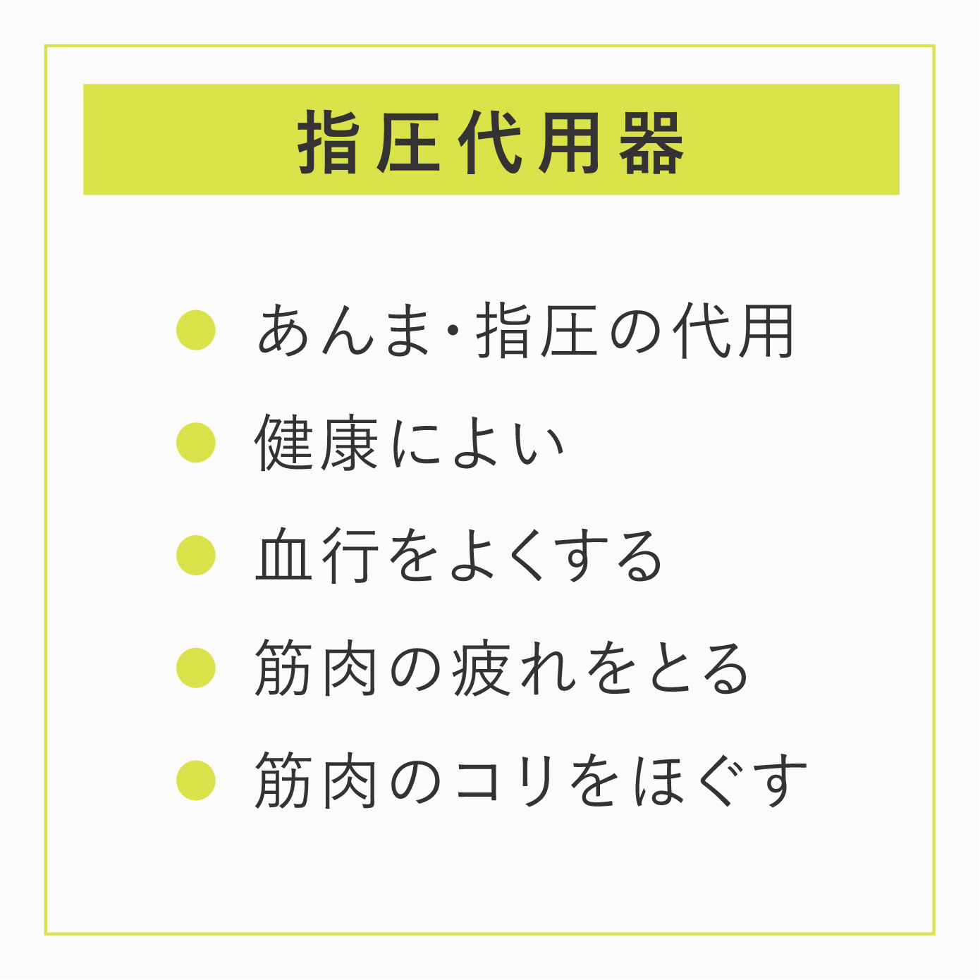 ・あんま、指圧の代用 ・健康によい ・血行をよくする ・筋肉の疲れをとる ・筋肉のコリをほぐす |