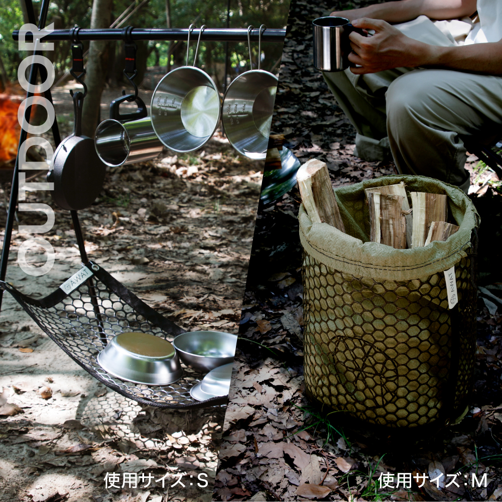 ギアや小物を直置きしたくない。調理道具などを洗った後の干し場に困る。ゴミ袋が自立せずに入れにくい。 そんなお困り事はマルチメッシュで解決。 タープに取り付けてギアを吊るしたり、ハンガーラックに取り付けて洗い終わった食器類を置くことができます。 メッシュを丸めて立てればゴミ袋スタンドにも早変わり。